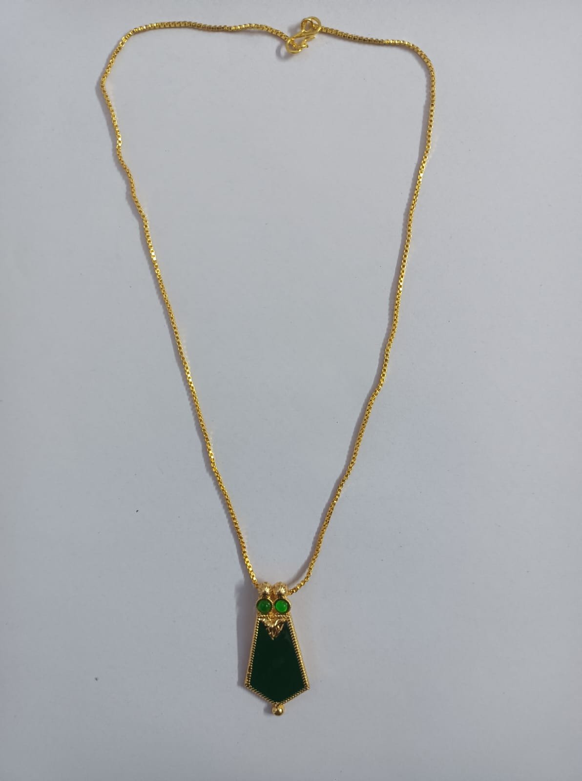 This elegant imitation jewellery piece features a delicate gold-plated chain paired with a unique geometric pendant. The pendant is accented by a bold green centerpiece in a tapered trapezoid shape, topped with two sparkling green crystal embellishments and intricate gold detailing. This lightweight necklace is perfect for both casual outings and festive occasions, offering a subtle touch of sophistication and a pop of color to any ensemble