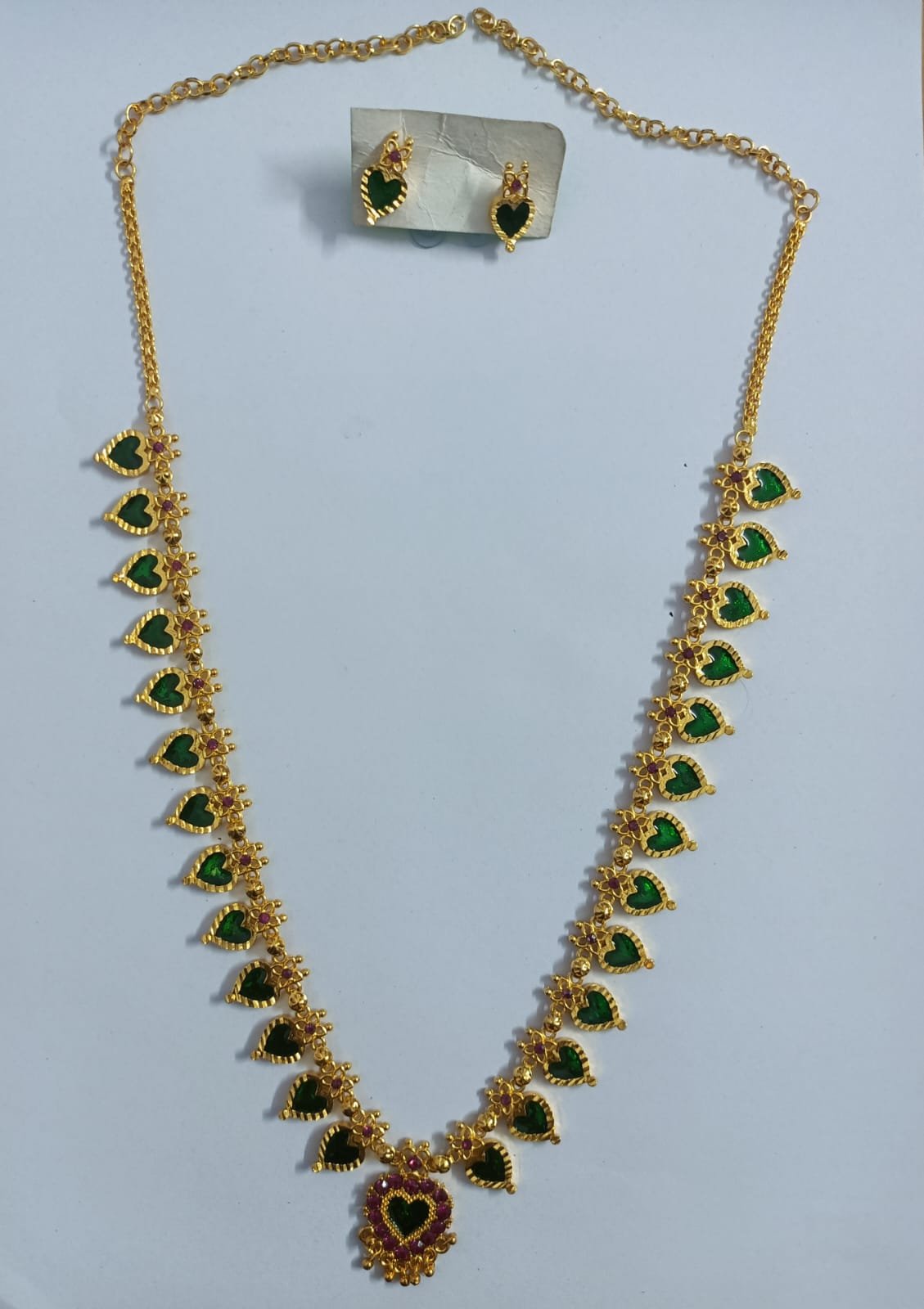 This exquisite imitation necklace set features a traditional gold-plated design adorned with vibrant green heart-shaped stones. Each link is delicately accented with a floral motif and small red stones, creating a striking contrast that highlights the green centerpiece stones. The set is completed with matching stud earrings, making it perfect for festive occasions, weddings, or traditional celebrations. Crafted for elegance and comfort, this necklace set brings timeless style without compromising on affordability