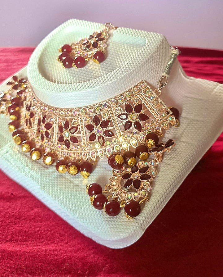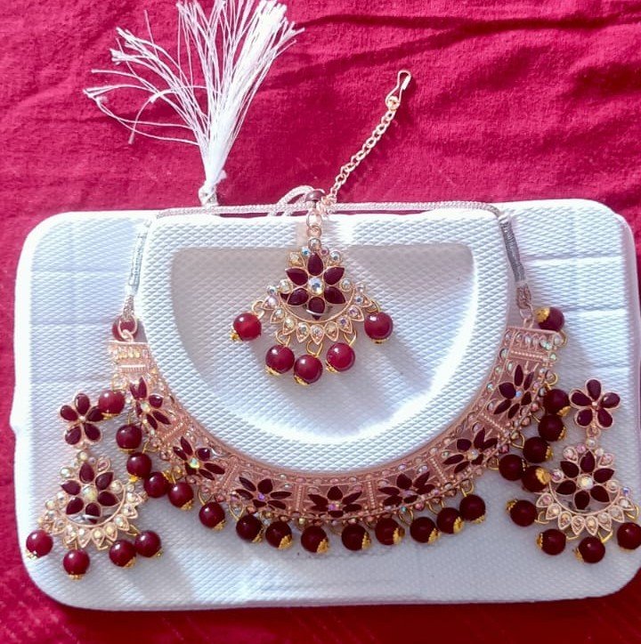 Elevate your ethnic or bridal look with this royal Maroon Beads Kundan Choker Necklace Set. Meticulously handcrafted, this set features an opulent gold-plated choker adorned with premium Kundan stones and rich maroon beads, creating a striking statement for weddings, parties, and festive celebrations. The coordinated set includes an adjustable choker necklace, a pair of matching earrings, and a maang tikka, all designed to add a touch of regal charm and sophistication to your attire