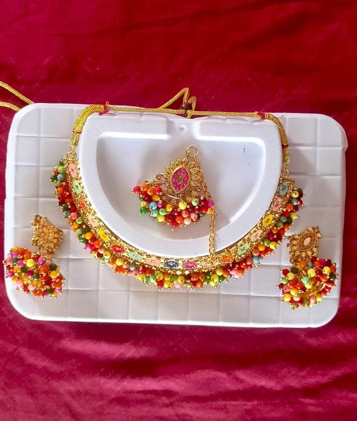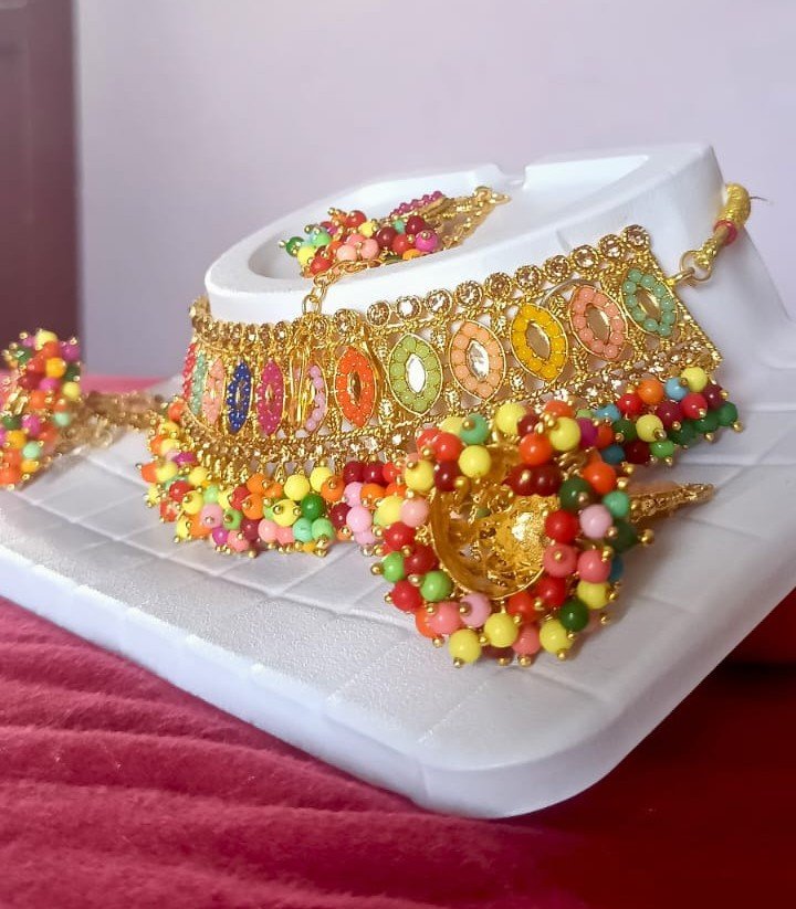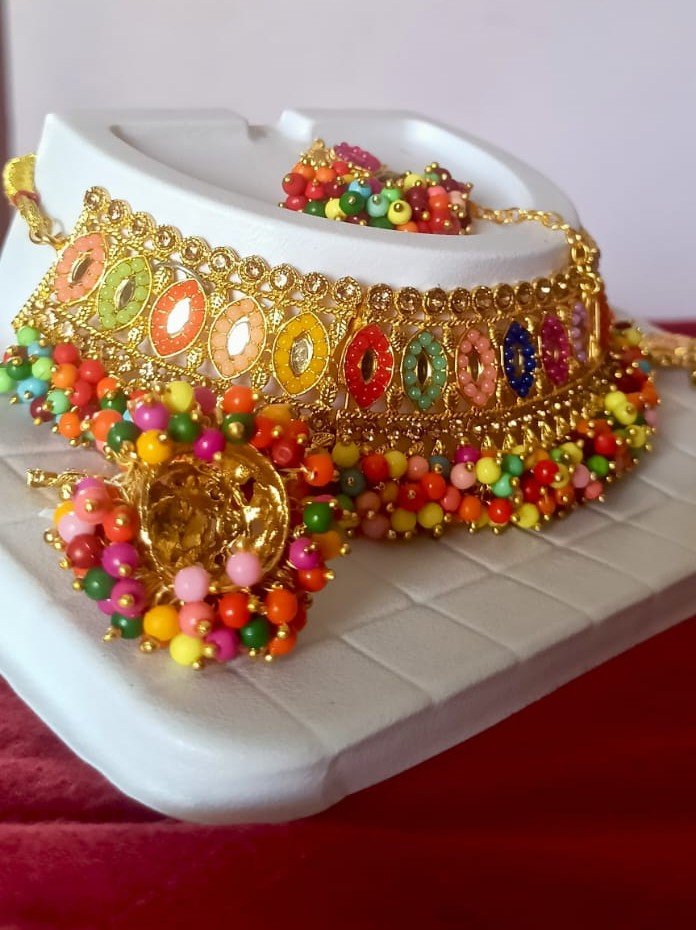Elevate your ethnic ensemble with this stunning Multicolor Beaded Kundan Choker Necklace Set. Crafted with high-quality alloy and finished with a rich gold plating, this set beautifully combines traditional Kundan artistry with a vibrant array of multicolored beads and stones. The choker necklace features intricate detailing, complemented by a pair of statement earrings and a coordinating maang tikka, making it a perfect choice for weddings, festive celebrations, and parties