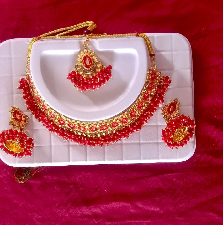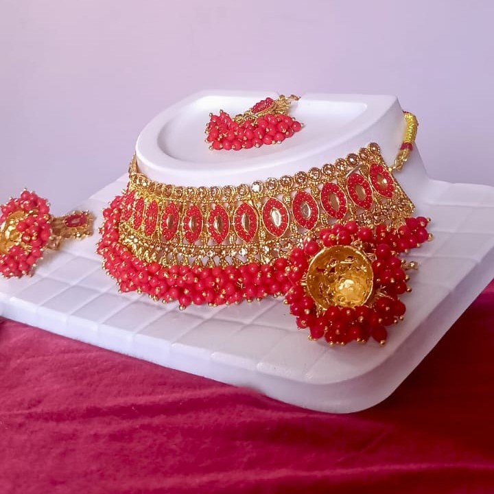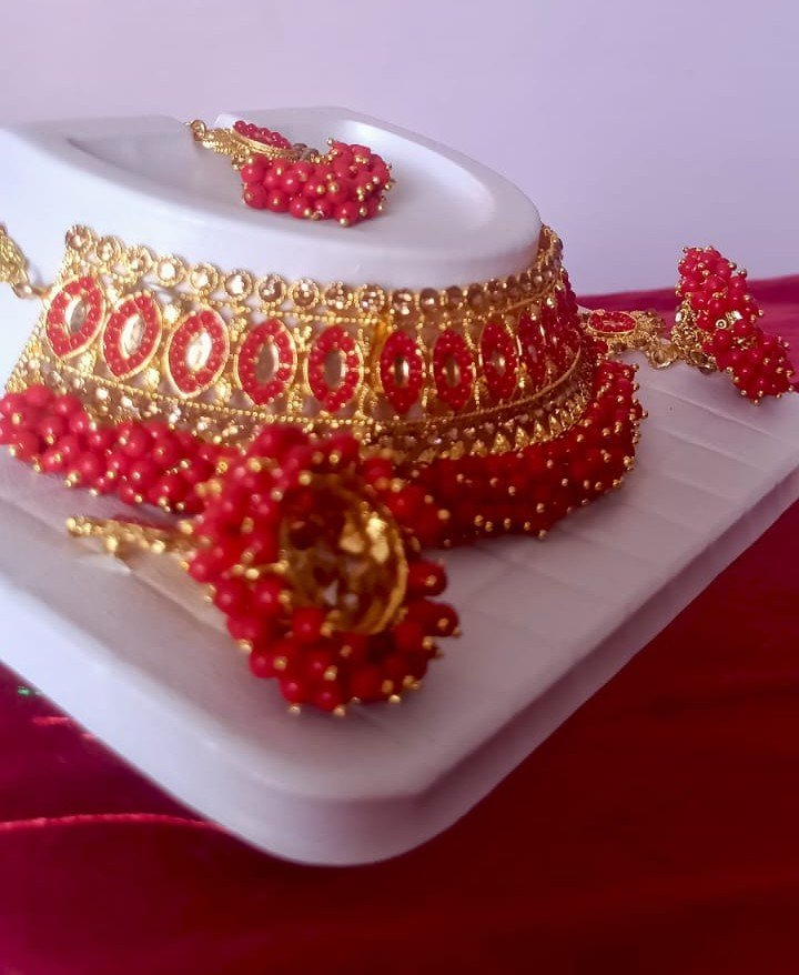 Make a bold statement at any celebration with this elegant Red Beads Kundan Choker Necklace Set. Finely crafted with gold plating and premium alloy, this traditional choker set is adorned with vibrant red kundan stones and beautifully strung red beads, exuding classic charm and sophistication. The set includes a matching pair of designer earrings and a maang tikka, offering a complete look for weddings, receptions, and festive occasions.